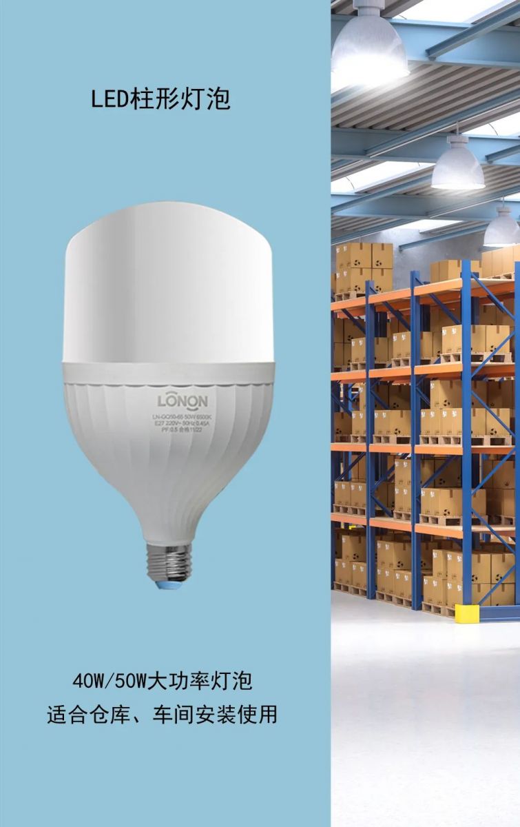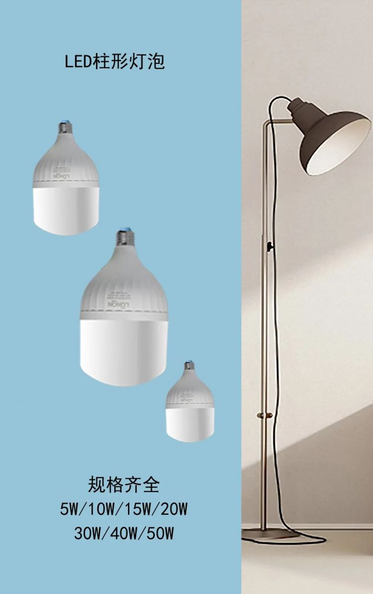 朗能LED柱形燈泡,產(chǎn)品規(guī)格齊全、多種功率選擇。 5W\10W\15W\20W\30W\40W\50W, 獨(dú)立安裝或配套吊燈、臺(tái)燈安裝使用,選擇多樣,應(yīng)用靈活,安裝便捷,家家戶戶都用得上!
