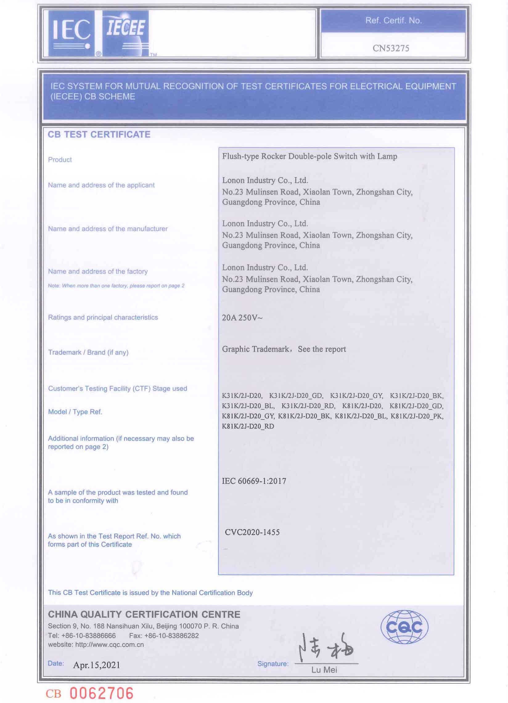 CN53275 K3K8_20A CB Test CERTIFICATE